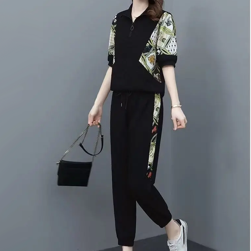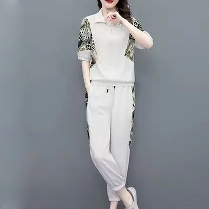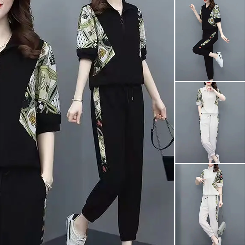 Damesset met bloemenprint, sporttop met korte mouwen en casual broek