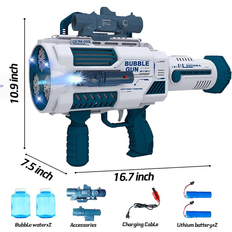 ULTIEME BUBBELARSENAAL INCLUSIEF - Beheers de volledige kit! Blijf schieten met het Gatling-geweer, ondersteund door 2 lithiumbatterijen en snel opladen, richt nauwkeurig met de richtkijker, verlicht de nacht met blauwe zaklampen en creëer non-stop vreugde. Alles voor epische bubbeloorlogen is hier!