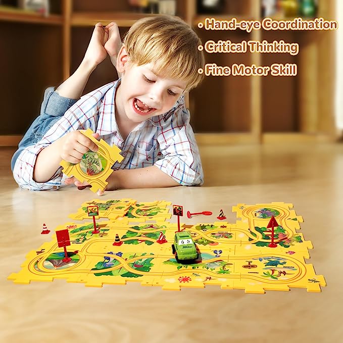 ✨【Een verscheidenheid aan thema's】Dinosaurus-, oceaan-, land- en ruimtethema's om uit te kiezen. De autospeelset bevat verschillende banen, loopings en hellingen die gemakkelijk in elkaar gezet kunnen worden om spannende raceavonturen te creëren.