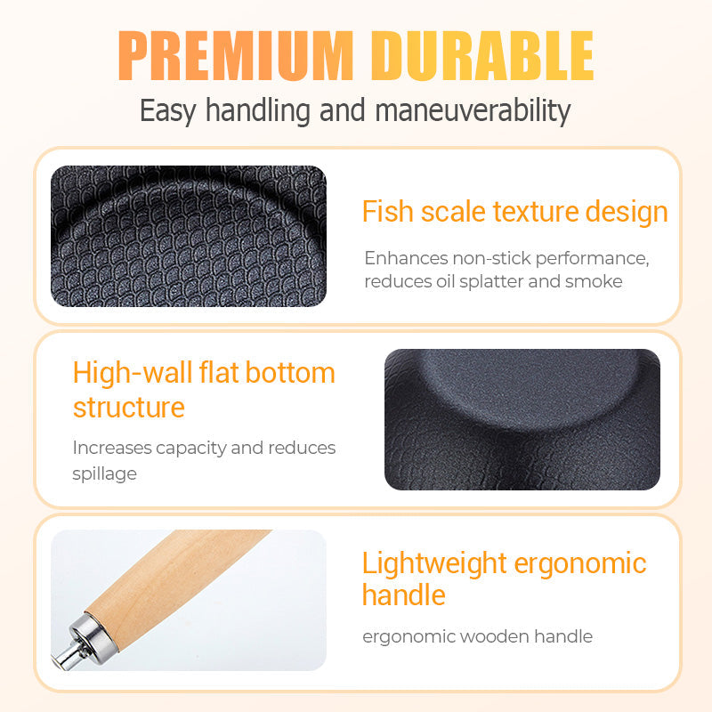 PREMIUM DUURZAAM MATERIAAL – Gemaakt van hoogwaardig, slijtvast materiaal, biedt deze pan uitstekende krasbestendigheid. Hij behoudt zijn superieure kookprestaties in de loop van de tijd en combineert veiligheid, duurzaamheid en langdurig gebruik.
