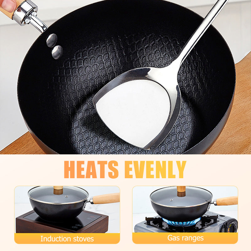 HOGE WANDEN EN VLAKKE BODEMSTRUCTUUR – Deze pan heeft verhoogde zijkanten voor een grotere capaciteit en minder morsen, evenals een vlakke, stabiele bodem die perfect werkt op inductiefornuizen, gasfornuizen en meer. Hij verhit gelijkmatig en is uitermate geschikt voor roerbakken, bakken, sudderen en al je favoriete kooktechnieken.