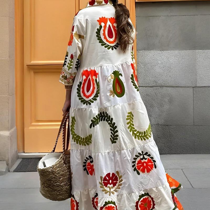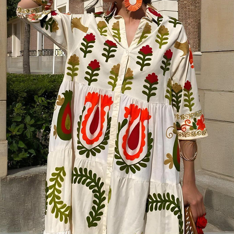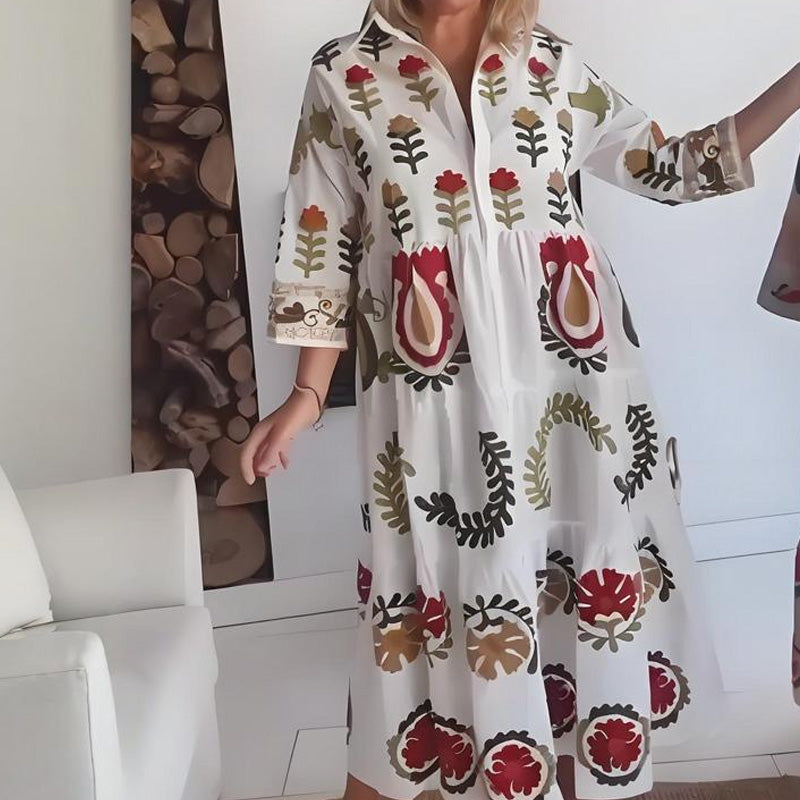 KNOOPSLUITING VOORZIJDE & OVERLAPKRAAG – Met een functionele knoopsluiting aan de voorkant met print geeft deze jurk u de flexibiliteit om uw look aan te passen. Geschikt voor elke gelegenheid, van casual uitstapjes tot lichte avondgelegenheden.