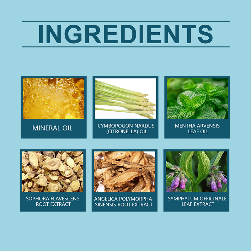 Ingrediënten product: Minerale olie, Citronella olie, Pepermunt olie, Sophora Flavescens extract, Engelwortel extract, Smeerwortel blad extract.