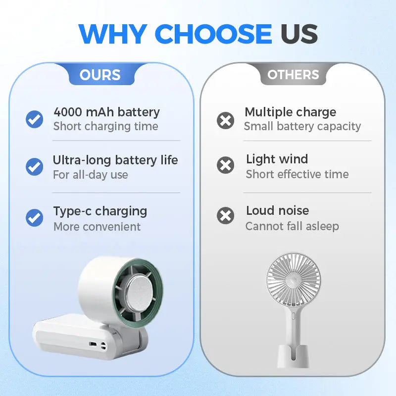 3-IN-1 GEBRUIKSMODUS: Deze draagbare handventilator met IJskoelvak biedt drie veelzijdige gebruiksmodi: draagbaar, op tafel en als nekband. Dankzij het verstelbare 135° vouwontwerp kunt u moeiteloos wisselen tussen de modi – of het nu tijdens het pendelen, werken op kantoor of bij buitenactiviteiten is.