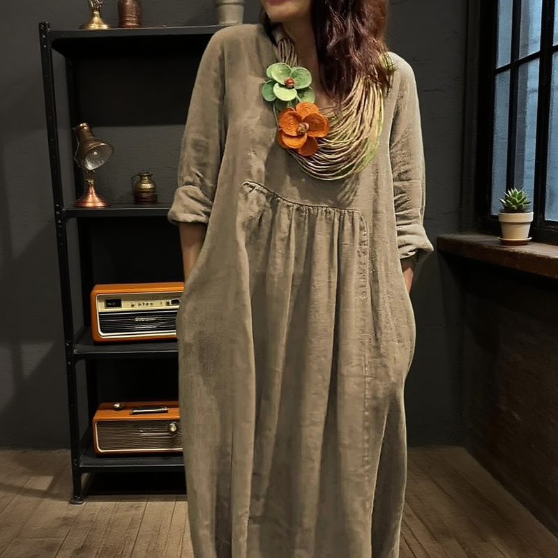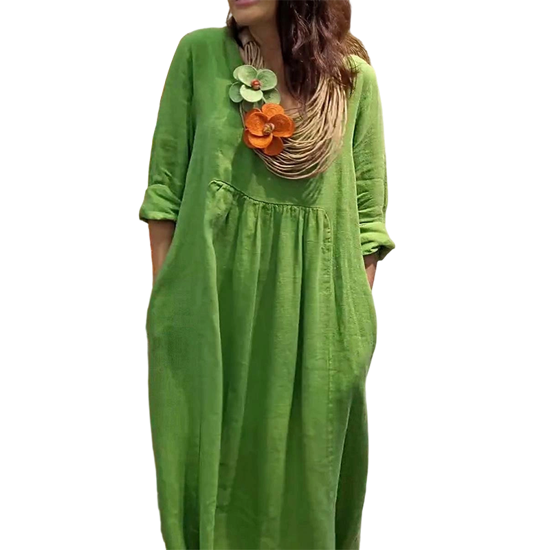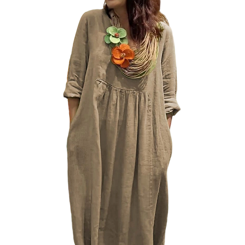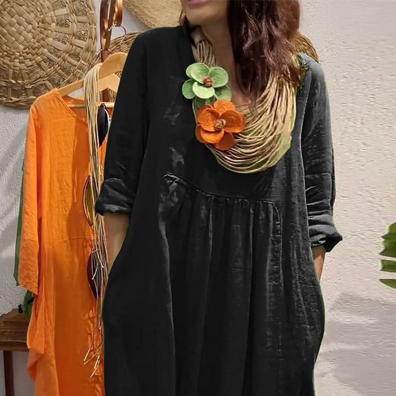 FUNCTIONELE ZAKKEN & V-HALS - Met praktische zakken en een flatterende V-hals combineert deze jurk stijl met functionaliteit. De zakken voegen gemak toe, en het ontwerp met V-hals versterkt de algehele elegantie.