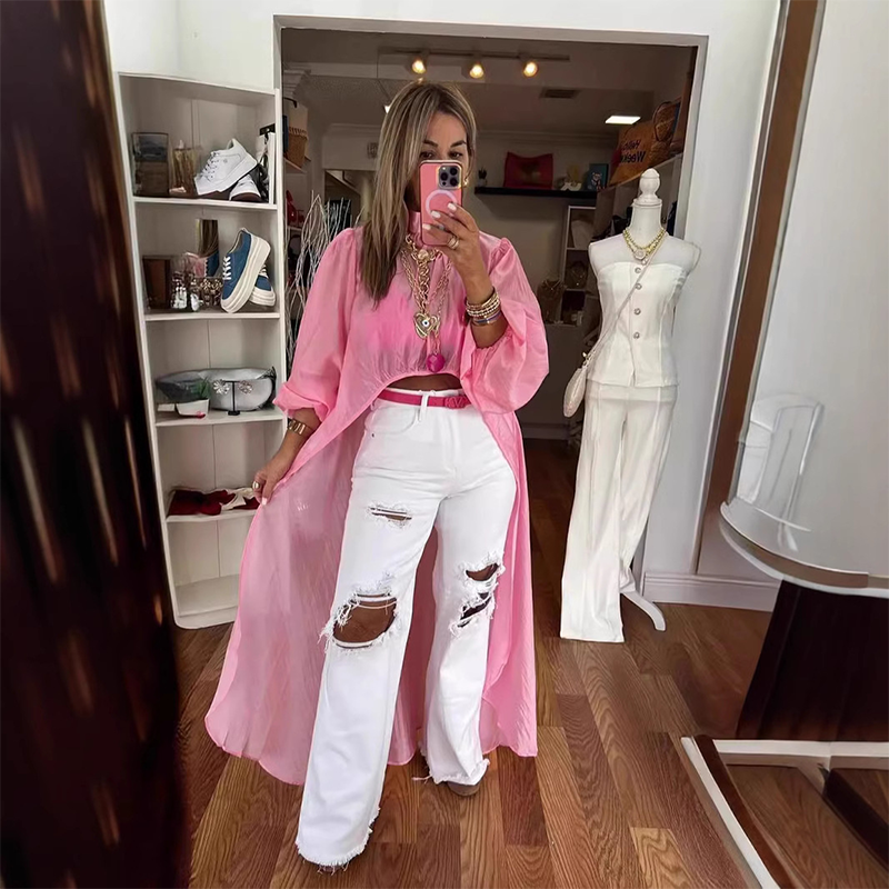 UNIEK ASYMMETRISCH ONTWERP – Het moderne, avant-gardistische silhouet met een kortere voorkant en langere achterkant zorgt voor dynamische bewegingsvrijheid. De semi-transparante stof creëert een subtiele gelaagde look, perfect om over hemdjes of bralettes te dragen voor een chique, modieuze statement.