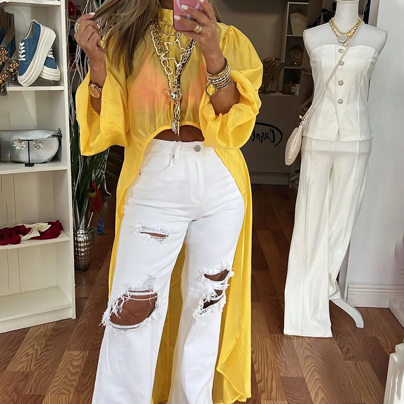 Pakketinhoud: 1 × Mandarijnkraag en asymmetrische top met pofmouwen