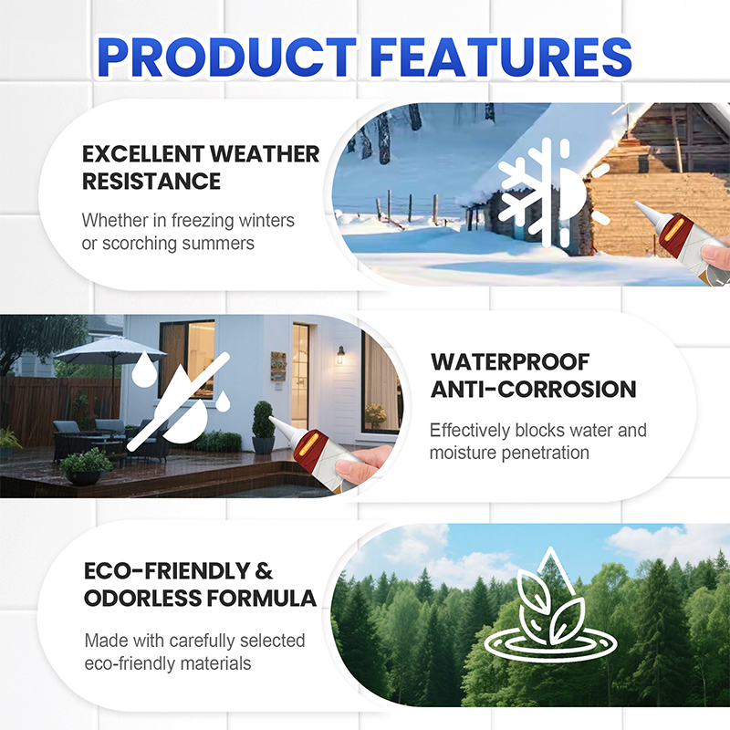 UITSTEKENDE WEERBESTENDIGHEID – Dit product is zeer goed bestand tegen veroudering en past zich moeiteloos aan verschillende weersomstandigheden aan. Of het nu vriest in de winter of snikheet is in de zomer: de vuller blijft flexibel en stabiel, zonder te scheuren, af te bladderen of te vervormen — voor een langdurig nette afwerking.