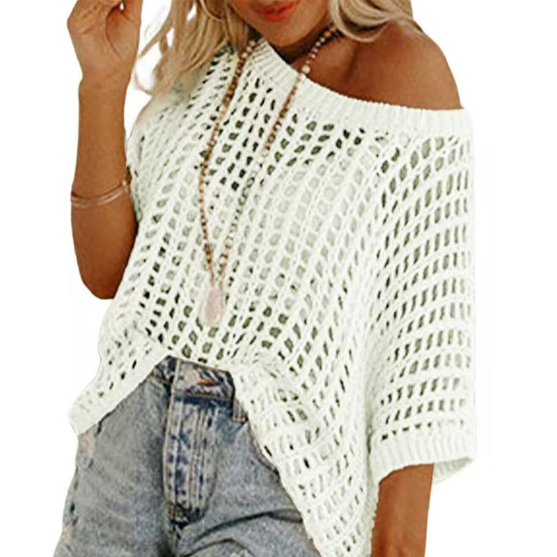 💥Prijs van de week special 💥Womens Summer Scoop Neck ShortSleeve Sweater Casual Crochet Hollow Out KnitTops