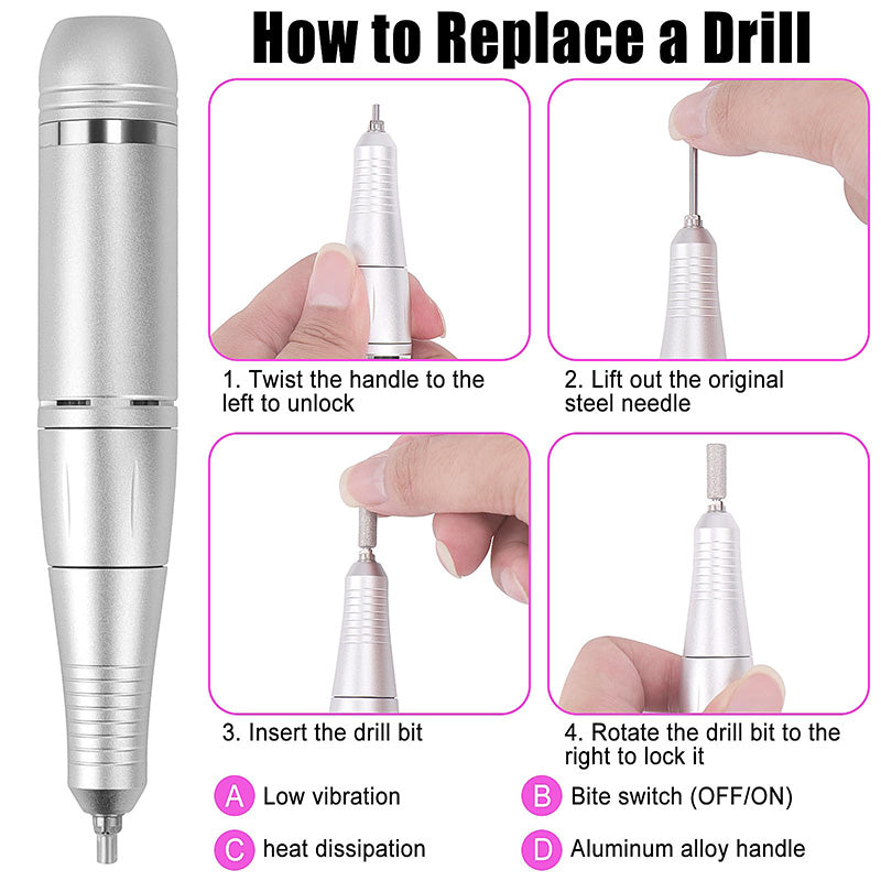 VERSATILE GRINDING HEADS EN EENVOUDIG VERVANGEN - De set bevat zes slijpkoppen geschikt voor verschillende nagelverzorgingsbehoeften, zoals het verwijderen van dode huid, eelt en polijsten. Het verwisselen van de koppen is eenvoudig: schakel het apparaat uit, ontgrendel door links te draaien, trek de kop eruit, plaats de nieuwe verticaal en vergrendel door rechts te draaien, waardoor het onderhoud snel en probleemloos verloopt.