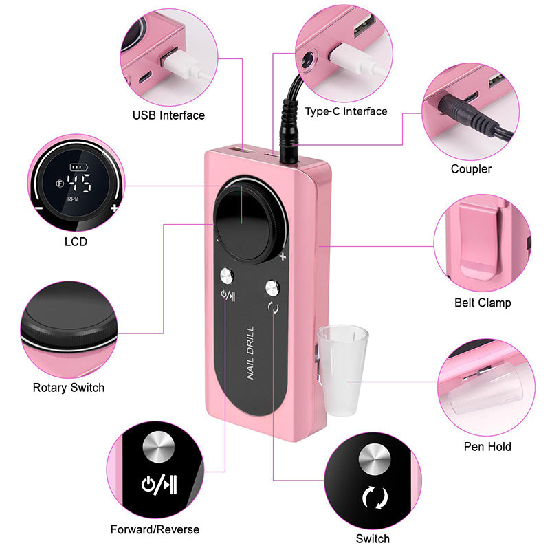 MULTI-INTERFACE DESIGN MET EXTRA USB OPLAADMOGELIJKHEDEN - Met USB, Type-C, polijst-interface en haakpoort, ondersteunt deze tool handige oplaadopties en bruikbaarheid. Bovendien kan de USB-poort ook gebruikt worden als oplader voor mobiele apparaten, wat naast nagelverzorging ook praktische waarde toevoegt.