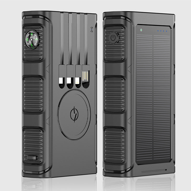 VIER INGEBOUWDE OPLAADKABELS EN DRAADLOOS OPLADEN: Deze draagbare powerbank op zonne-energie beschikt over vier ingebouwde kabels en ondersteunt draadloos opladen, waarmee je meerdere apparaten tegelijkertijd kunt opladen met veelzijdige compatibiliteit en het gemak van draadloos opladen, ideaal voor groepsuitstapjes of noodgevallen.