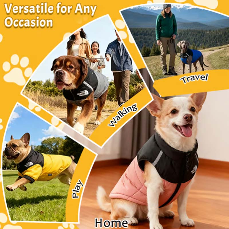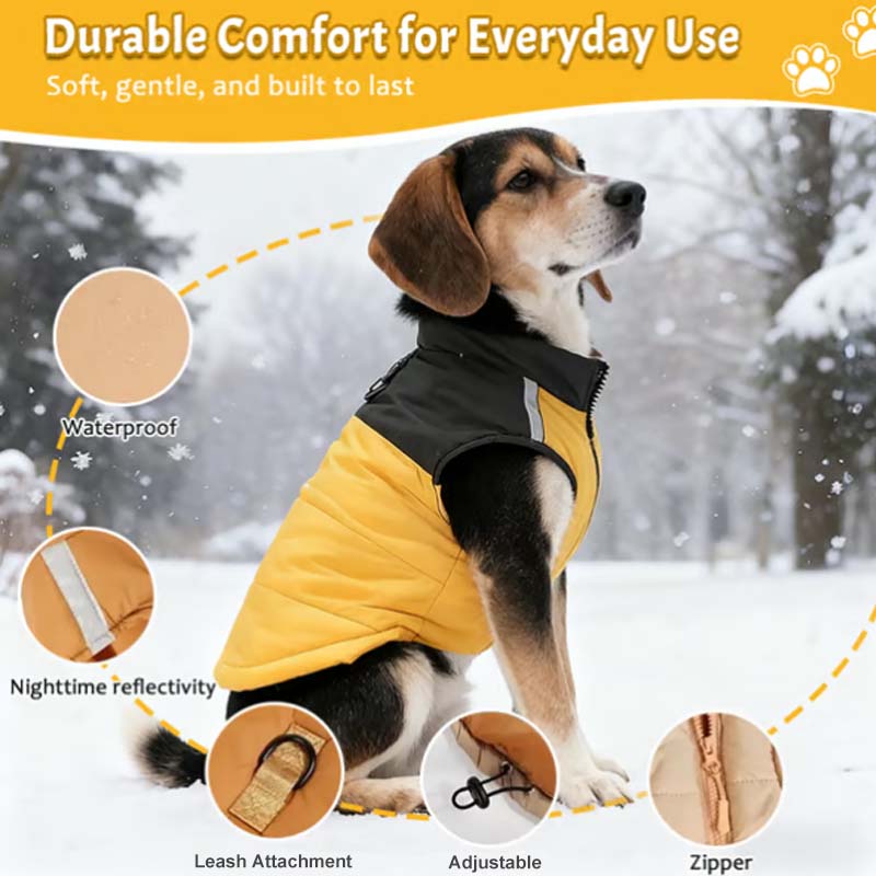 WARME EN COMFORTABELE STOF: Gevoerd met zachte, isolerende stof, houdt deze jas je huisdier warm en comfortabel, zelfs op de koudste dagen. Hij biedt optimale bescherming tegen de kou zonder de bewegingsvrijheid te beperken.