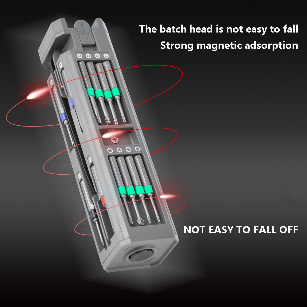 Bovend houdt een ingebouwde bitopslag uw schroeven veilig en georganiseerd vasthoudt, zodat u geen moeite hebt om ze te zoeken en de maten te vinden die het beste bij de schroeven passen. Ook vindt u snel het gereedschap dat u nodig hebt zonder te hoeven graven in een zak met ander gereedschap. Ondertussen zorgt het ingebouwde pop-out ontwerp ervoor dat u uw gereedschapset gemakkelijk kunt openen.