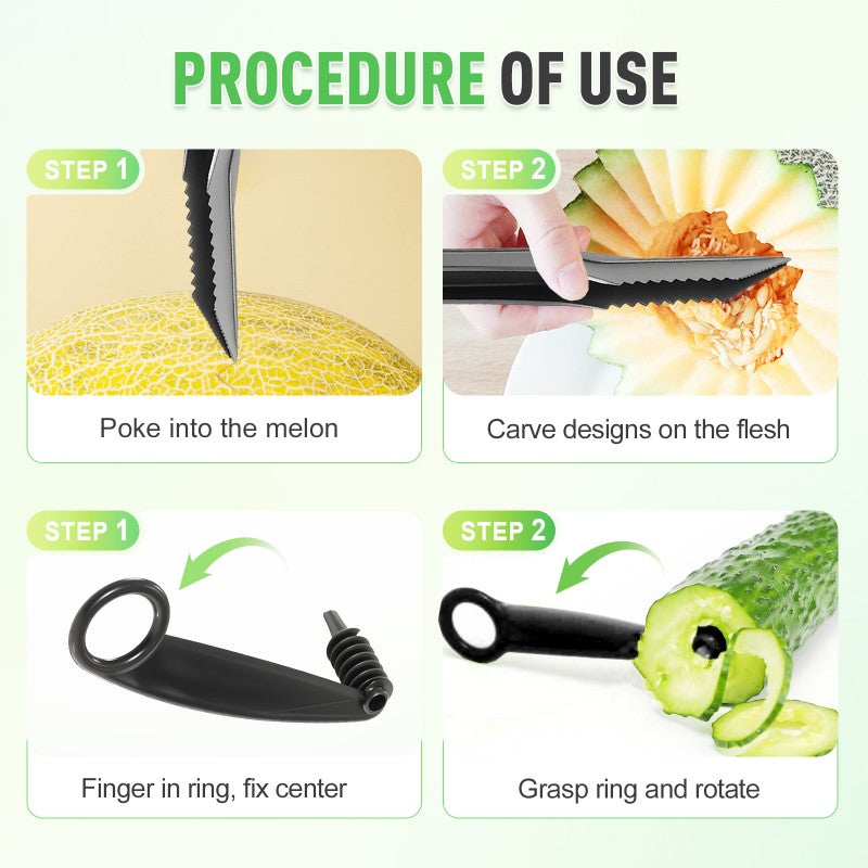 NAUWKEURIG VERVAARDIGDE MESSEN – Gemaakt van roestvrij staal van voedselkwaliteit, met een dikte van 3 mm. Deze messen snijden met chirurgische precisie door meloenen, komkommers en appels. De roestbestendige randen behouden jarenlang hun scherpte en snijden scherpe spiralen en vlijmscherpe V-groeven die producten omtoveren tot eetbare, prachtige vormen of geometrische meesterwerken.