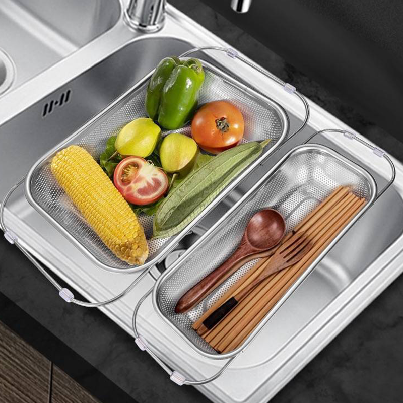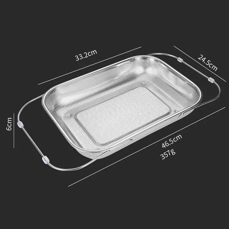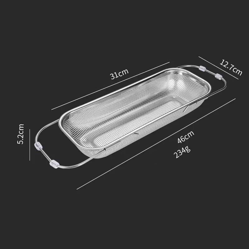 VERSTELBARE PASVORM VOOR VERSCHILLENDE SPOELEN: Voorzien van een telescopisch ontwerp met dubbele oren dat uitzet en krimpt om op verschillende spoelbakken te passen. Uitgerust met antislip siliconen nopjes die de spoelbak stevig vasthouden, beweging tijdens gebruik voorkomen en stabiliteit bieden tijdens het wassen of afdruipen.