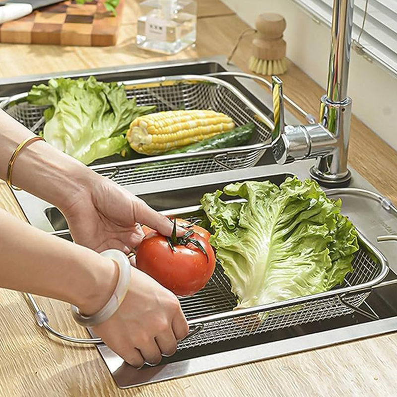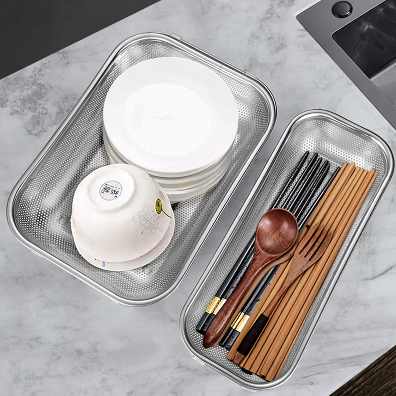MULTIFUNCTIONEEL AFDRUIPEN EN OPBERGEN: Fijn geperforeerd gaas zorgt voor snelle waterafvoer en houdt kleine items zoals eetstokjes, bestek of delicate producten veilig vast. Kan ook dienen als opbergbak voor fruit, groenten of borden, waardoor veelzijdig gebruik mogelijk is naast basisafdruiptaken.