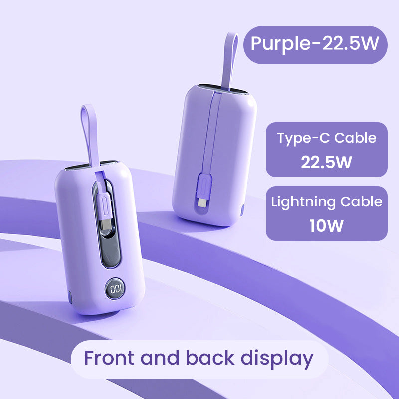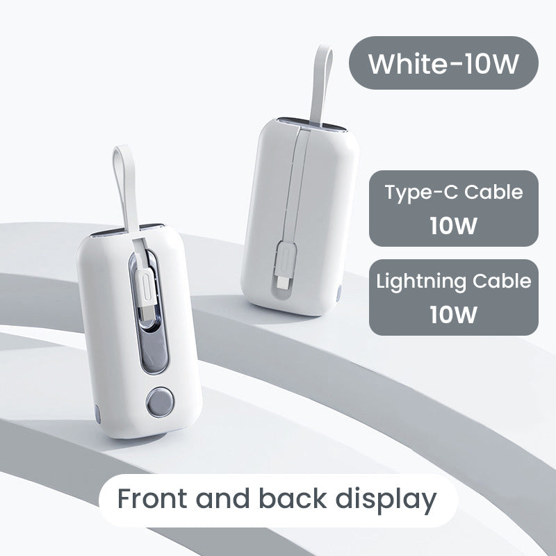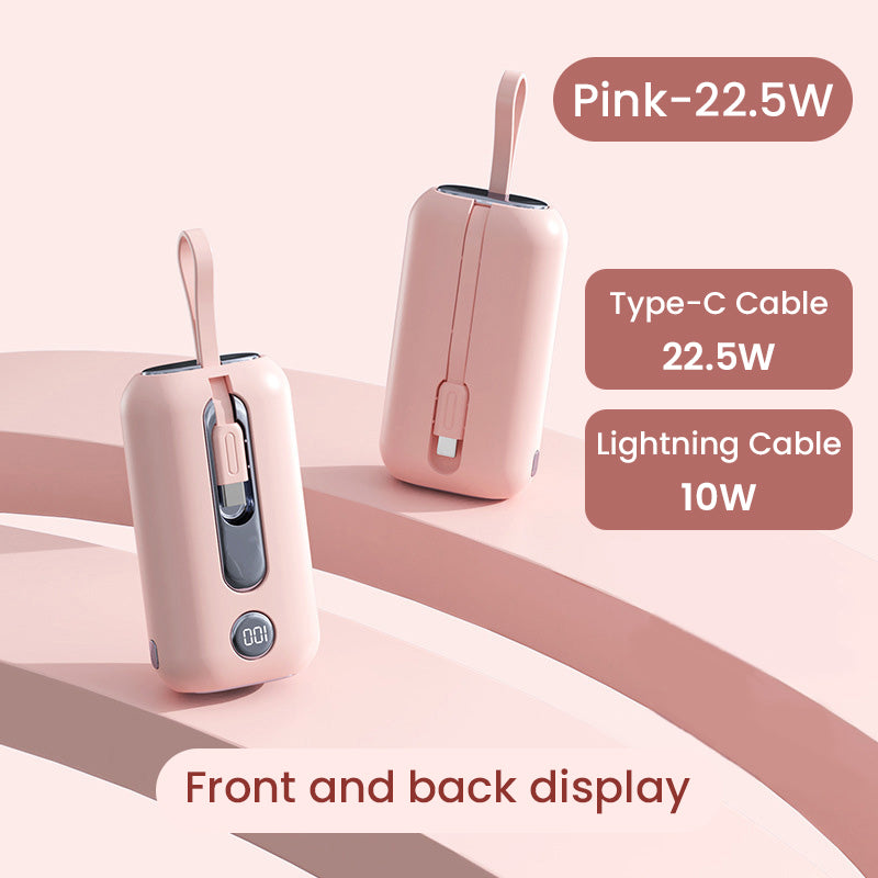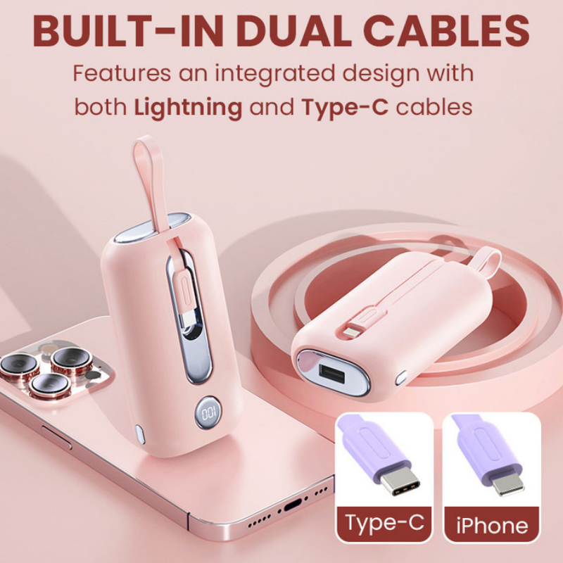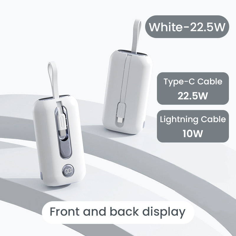 INGEBOUWDE DUBBELE KABELS: Voorzien van een geïntegreerd ontwerp met zowel Lightning- als Type-C-kabels die ook als draagkoord kunnen dienen, zodat je geen extra laadkabels meer hoeft mee te nemen. Dit biedt gemak en compatibiliteit met diverse apparaten.