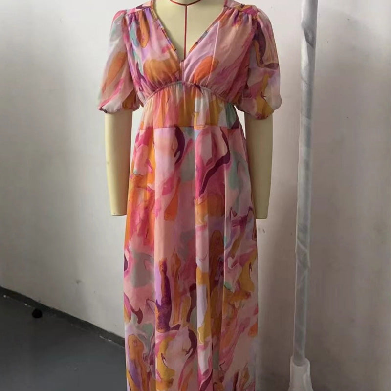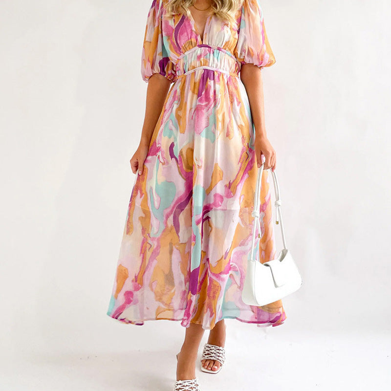 Boheemse Lange Jurk met Pofmouwen en V-Hals voor Dames