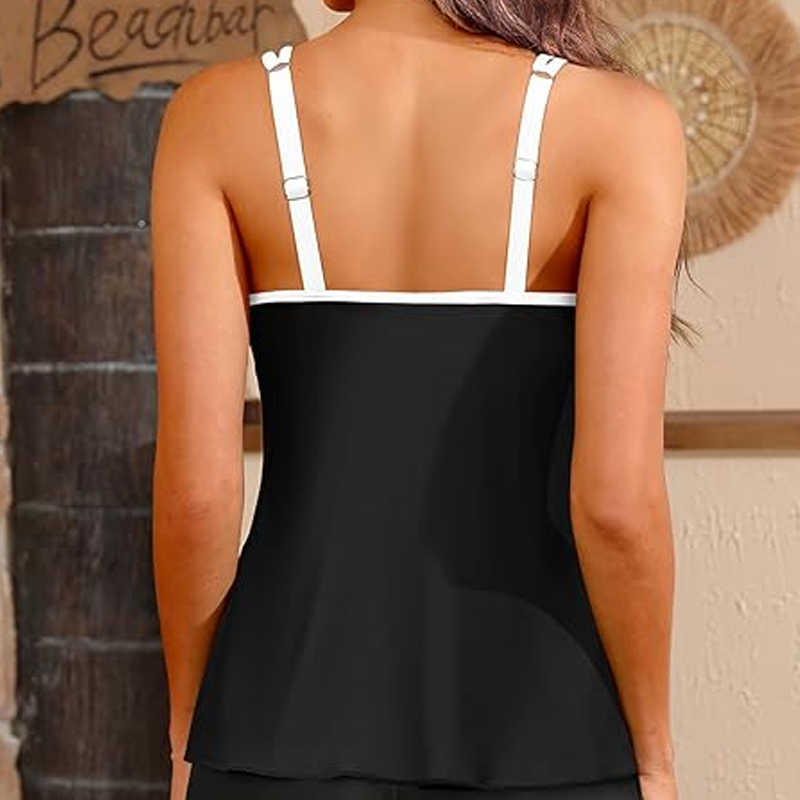 CASUALE TANKINI TOP MET SHORTS: Geniet van moeiteloze stijl met deze 2-delige badkleding set, ontworpen voor comfort en veelzijdigheid. De tankini top heeft een losse pasvorm, perfect om te ontspannen bij het zwembad of voor een dagje strand.