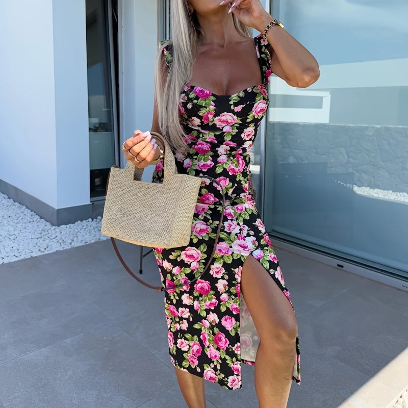 Elegante jurk met bloemenpatroon en zijsleuf voor vrouwen