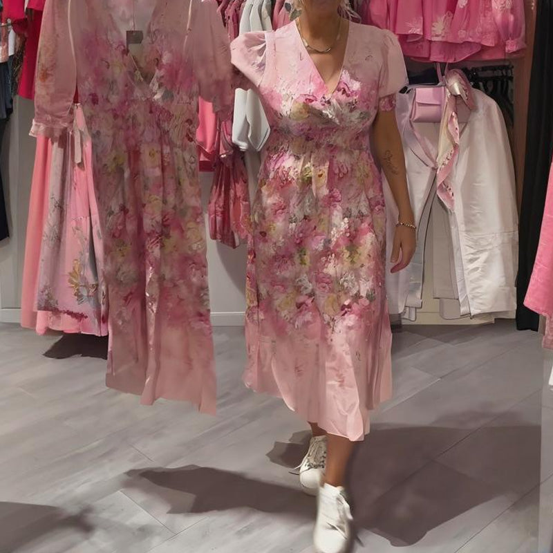 ELEGANT BLOEMENONTWERP: De zachte roze basis gecombineerd met romantische bloemenprints creëert een moeiteloos elegante look, perfect voor bruiloften, tuinfeesten, dates of weekenduitstapjes.