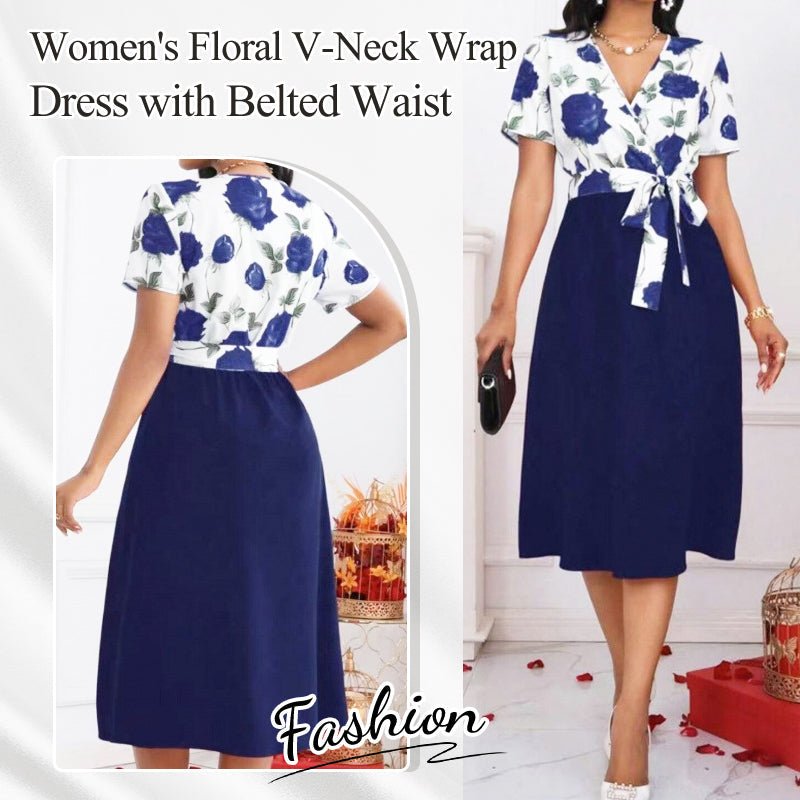 Dames wikkeljurk met bloemenpatroon, V-hals en riem