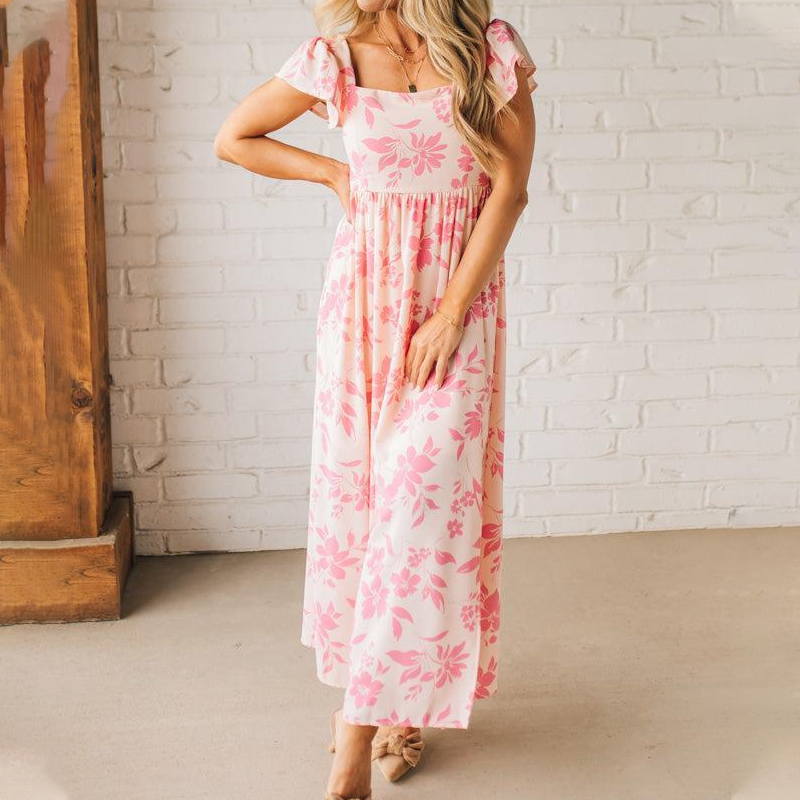 ELEGANT BLOEMENONTWERP: Deze jurk is versierd met een prachtige roze bloemenprint en voegt een frisse, vrouwelijke uitstraling toe aan je garderobe – perfect voor de lente en zomer, of een dagje uit.