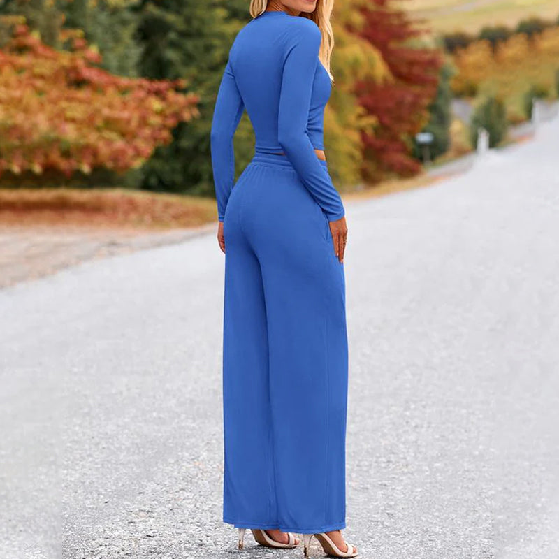 MODERN COORDINATED LOOK – This two-piece outfit includes a slim-fit long sleeve top paired with wide leg pants, creating a stylish silhouette that blends sophistication and ease for an effortlessly put-together, fashion-forward appearance.
